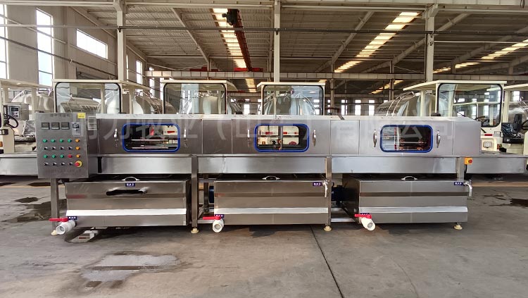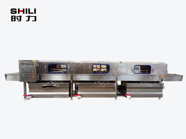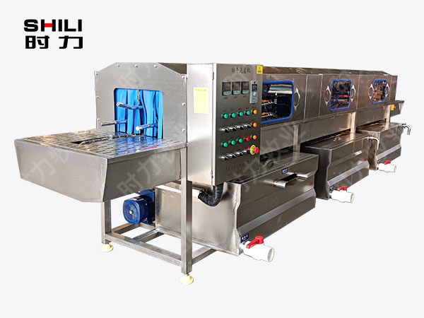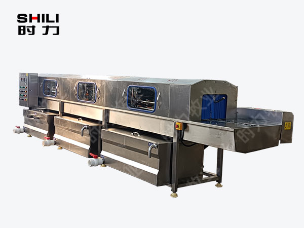 整機采用四面噴淋,三段清洗,第 一段為熱堿水,第二段為熱清水,第三段為自來清水,熱水箱兩段內分別設有電加熱管道;帶有溫度控制裝置,溫度從常溫至90°C自由設定。各個循環水箱均采用臥式加立式不銹鋼離心水泵循環噴淋,從上、下、左、右,四個方向同時對產品進行噴淋沖洗;需清洗的產品由不銹鋼鏈條輸入清洗機中,依次通過人工上桶→ 自動除渣→高壓主洗→高溫預漂洗→高溫清水漂洗連續式清洗;每個水箱均設有過濾網裝置,便于隨時清理。